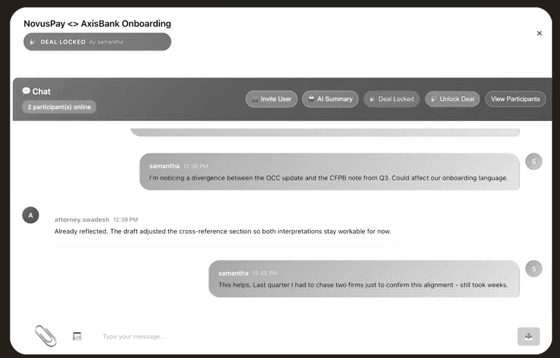Deal execution today is slow and siloed—negotiations spread across endless emails, chats, and documents. This fragmentation causes misalignment, delays, and lost opportunities. NeuroCircle lets you execute deals in real time in its integrated deal room—Corem.